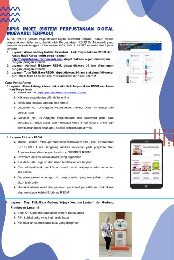 SIPUS IMOET merupakan sistem perpustakaan digital yang dimiliki oleh Perpustakaan RSUD Dr. Moewardi. Inovasi ini diluncurkan pada tanggal 13 November 2024 dengan dilengkapi 3 jenis layanan yang dapat diakses 24 jam secara daring yaitu: